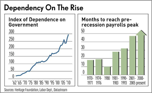 The American public’s dependence on the federal government shot up 23% in just two years under President Obama, with 67 million now relying on some federal program, according to a newly released study by the Heritage Foundation….