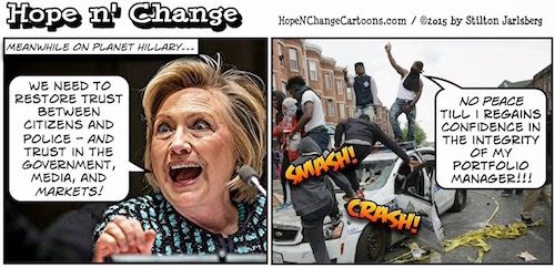Then Obama made yet another speech telling us how cops are racist. Understand that his attacks on cops are an attack on all of us normal Americans. Like soldiers, the police come from the ranks of us normal Americans, not the elite. And just as with soldiers, we normals revere cops as symbolic of the best of how we see ourselves – loyal, brave, patriotic protectors of order and decency. Obama – the guy who immediately assumed a Cambridge cop acted “stupidly” – as well as Hillary Clinton and the liberal elite, attacked cops as racist and evil as surrogates for attacking us as racist and evil.