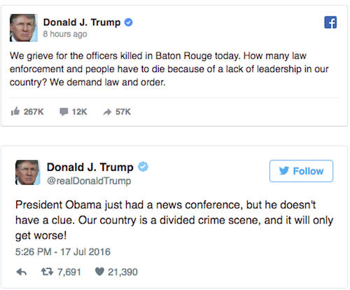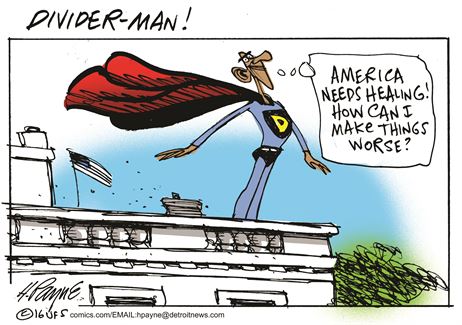 And how does The Great Divider, whose every word and action heretofore have been intended to break the country down into warring tribes, react to the latest fruit born by the seeds he’s sown?