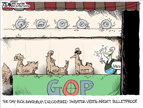 Rick Santorum is a bright guy who has performed well in the debates, and he is hot, this week, in the Republican base. But he doesn’t have the chance of a snowball in Hell of being elected president. He couldn’t even get re-elected to the Senate in his home state of Pennsylvania in 2006. The 2012 election will be almost entirely about the economy, although national security is always relevant to a presidential contest. It would be suicidal for the GOP to nominate a candidate whose signature issues are gay marriage and abortion.(Think “Independents”) At the end of the day, the party won’t be that dumb. But the fact that the party’s base is flirting with Santorum manifests a lack of seriousness that may prove fatal in November.