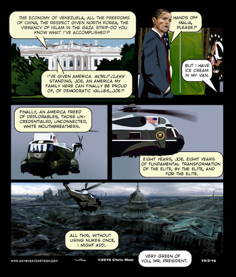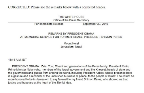 It’s Monday, October, 3rd, 2016…but before we begin, like the scorpion with the frog, The Dear Misleader just can’t help himself, using the occasion of Shimon Peres’ funeral not only to bore the world with more self-serving first person observations, but to demonstrate one last bit of disrespect for the only bastion of freedom and functioning democracy in the Middle East: