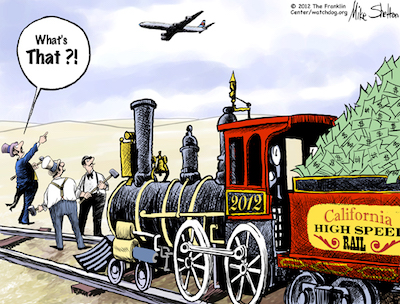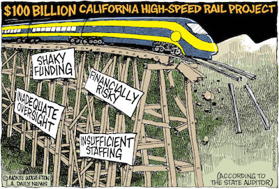 A few problems: Cap and trade faces legal challenges that have curbed the demand for and price of permits. A quarterly auction in May raised only $10 million of the $500 million projected, and the legislature has balked at extending cap and trade beyond 2020. Three quarters of the money for the first segment of the $64 billion choo choo may never materialize.