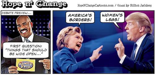 And as we note at our Video of the Day, accessible through link #2 immediately below our Quote of the Day at the top of the page, can it be mere coincidence the Fourth Estate broke Trump’s p*ssy-grabbing commentary at the same time Hillary’s open-borders policy was made public?!?