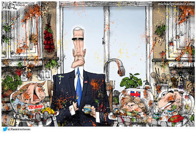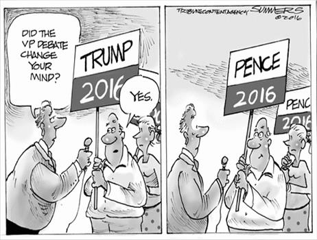 * Mike Pence:From the very beginning, Pence was the more comfortable of the two men on the debate stage. Pence repeatedly turned to the camera when he answered questions, making clear he understood that the real audience wasn’t in the room but watching on TV. The Indiana governor was calm, cool and collected throughout—a stark contrast to the fast-talking (and seemingly nervous) [Tim] Kaine…