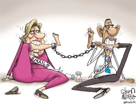 As secretary of state she kept classified documents on the home-brew server in her basement, which is against the law. She lied about it to the American people. She couldn’t remember details dozens of times when questioned by the FBI. Her aides destroyed evidence by BleachBit and hammers. Her husband, Bill, met secretly on an airport tarmac with Attorney General Loretta Lynch for about a half-hour, and all they said they talked about was golf and the grandkids.