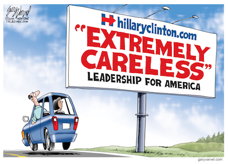 “So, herewith America’s choice. Restore the House of Clinton. Or confer executive powers — powers that President Obama by his audacity, and Congress by its lethargy, have proven to be essentially unlimited — on another competitor in the sleaze sweepstakes, Donald Trump, who shares his opponent’s disinclination to disentangle the personal and the political.“