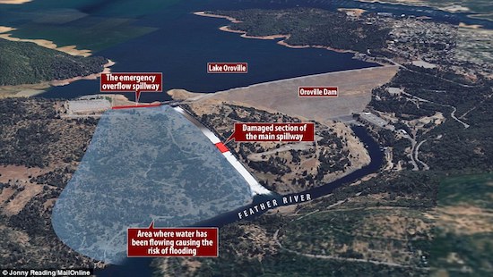 “More than a decade ago, federal and state officials and some of California’s largest water agencies rejected concerns that the massive earthen spillway at Oroville Dam — at risk of collapse Sunday night and prompting the evacuation of 185,000 people — could erode during heavy winter rains and cause a catastrophe. Three environmental groups — the Friends of the River, the Sierra Club and the South Yuba Citizens League — filed a motion with the federal government on Oct. 17, 2005, as part of Oroville Dam’s relicensing process, urging federal officials to require that the dam’s emergency spillway be armored with concrete, rather than remain as an earthen hillside.