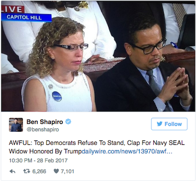 During the speech’s most extraordinary moment, the tribute to Carryn Owens, wife of slain SEAL Ryan Owens, one notable Democrat who refused to stand was Rep. Keith Ellison, who just lost a close race for Democratic National Committee chairman to Obama Labor Secretary Thomas Perez, also a man of the left.