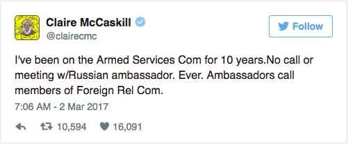 McCaskill later blamed Twitter’s character limit for the seeming disparity in her tweets, suggesting the limit prevented her from being more specific in Thursday’s tweet. She downplayed the significance of her own conversations with Russia’s ambassador.“