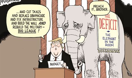 Thanks to congressional Republicans, the deficit is today much smaller than what it was during the reign of the triumvirate of Barack Obama, Harry Reid, and Nancy Pelosi, but we still run a deficit. The Congressional Budget Office projects that under current law — which is to say, even without Trump’s proposed $1 trillion stimulus — federal spending will grow by about 60 percent in the next ten years, driven largely by the parts of the budget that nobody wants to touch: entitlements. Federal spending as a share of GDP is expected to remain higher than its average over the last 50 years. If Republicans should decide to get rid of the unpopular parts of the Affordable Care Act (the taxes and individual mandate) and keep the popular ones (the subsidies), then you can expect that number to get even worse.