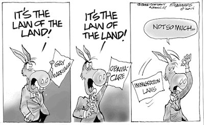 …There is one common denominator in all these instances of attempted legal nullification: the liberal belief that laws should “progress” to reflect the supposedly superior political agenda of the left. And if laws don’t progress?Then they can be safely ignored.