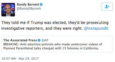 Now, California attorney general Xavier Becerra has filed 15 felony charges against Daleiden and Merritt, the journalists who exposed the brutality and profiteering of Planned Parenthood and its affiliates, on the grounds that ostensibly business-related conversations among strangers held in restaurants and at conferences were in fact “confidential,” and so recording them without every participant’s consent violated California eavesdropping laws. You can read all about this news at the New York Times, the Washington Post, and CNN.