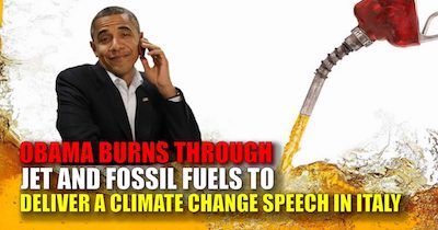 …In just his trip back and forth to Italy, for his presentation and his vacation, Barack Obama has emitted more than 16 metric tons of carbon – just shy of what an average American emits in a year. Add to that the motorcade, the internal travel in Italy, and, of course, the villa, and Obama and his wife have easily emitted more carbon in one single week than most Americans will in 2017.