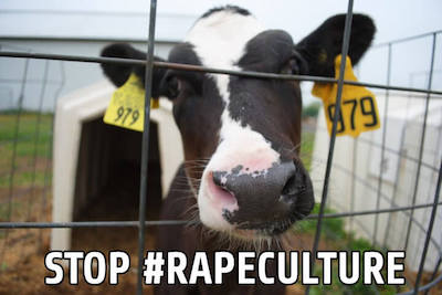 Contrary to popular belief, female cows produce milk only when they’re pregnant or nursing. They make milk for the same reason that human women do: to feed their babies. Cows who are imprisoned on dairy farms are forcibly impregnated through artificial insemination again and again on rape racks. Rape racks. All for your milk, cheese, and yogurt.