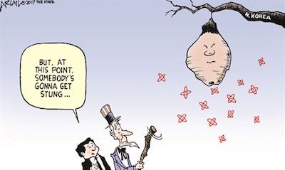 Kim Jong-un has accomplished something that neither his grandfather nor father pulled off during the last 70 years: bringing an existential threat to the shores of the United States. North Korea’s handful of missiles that are soon to be pointed our way will be seen as posing a greater existential threat than do the far more numerous nuclear-tipped missiles of Russia and China — on the premise that by feigning (?) madness Kim is far more likely to use them. How weird that the really dangerous adversaries are seen as posing a far lesser danger than the far weaker one. Iran is looking at all this as a tutorial.