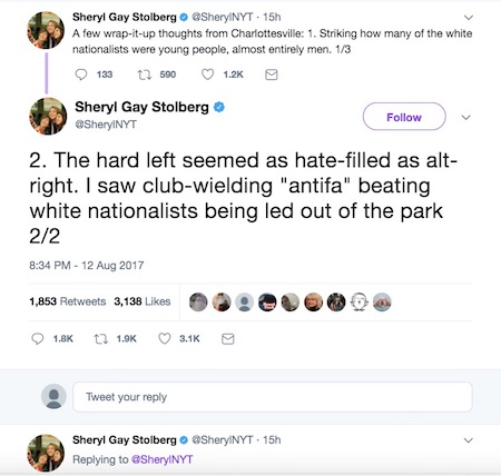 Over the last 24 hours, it’s become unacceptable in some quarters to point out that there was violence on both sides in Charlottesville, even though it’s unassailably true. Here is a New York Times reporter from yesterday: