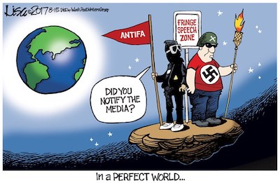 This doesn’t make the neo-Nazis any better; they are obviously evil, and their idiot march was the proximate cause of the violence, and one of them committed an act of murder and domestic terrorism. But anti-fa is also hate-filled and violent and was spoiling for a fight.Any person of good will committed to liberal values should be perfectly happy to denounce them both.