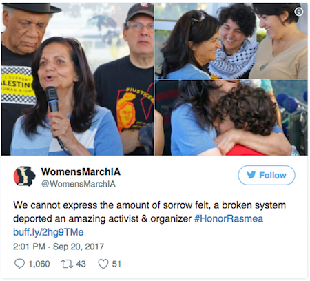 “Convicted terrorist-turned-Women’s March organizer Rasmea Odeh has been deported from the United States to Jordan after it was revealed that she lied on her application for a U.S. visa and for U.S. citizenship.Odeh did not state on her application that she was convicted in 1970 for two bombings in Jerusalem that resulted in the deaths of two people, and hence was tried for immigration fraud. After several appeals and a vacated sentence, on March 23, 2017 Odeh was sentenced to be deported and to be stripped of her U.S. citizenship. Her citizenship was formally revoked on August 17.