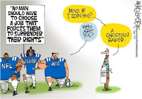 Yep, it’s the old, “you’re either with us or against us,” philosophy.You cannot sit out thismanufacturedcontroversy. The Huffington Post says that when you stand, you stand for white supremacy. For white people, the anthem represents freedom.(You know,…like the Civil War and Civil Rights Act never happened!)White Americans are full citizens, and black Americans–especially extremely successful millionaire athletes–are second class citizens.