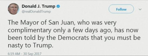 Obviously, the human catastrophe in Puerto Rico continues to be dire. Pray for Puerto Rico. And much work still needs to be done. But it’s just inaccurate (intentionally inaccurate) to suggest that Trump has not taken every conceivable action to help the 3.4 million people of Puerto Rico.