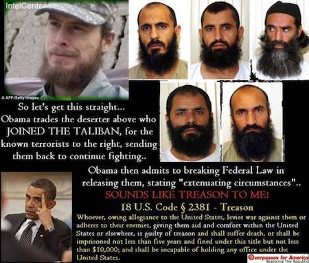News of Bergdahl’s plea is particularly noteworthy as The Obamao gave up five…count ’em, FIVE…unrepentant enemies of the country HE swore an oath to protect and defend in order to secure the release of a traitor who willingly aided and abetted the efforts of a foreign foe. We don’t refer to B. Hussein as the Manchurian-in-Chief…