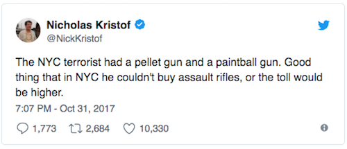 “…In the aftermath of the attack, Kristof tweeted, “The NYC terrorist had a pellet gun and a paintball gun. Good thing that in NYC he couldn’t buy assault rifles, or the toll would be higher.” Dude, are you kidding me? First, yes—let’s breathe a sigh of relief that he didn’t use a gun. It’s not like he used a motor vehicle or anything. Second, terrorists and criminals don’t follow the law (obviously), and Saipov wasn’t from New York, so what does strict gun laws have anything do with it? Did Kristof even read the Associated Press or any other news report prior to sending this tone-deaf tweet? If he didn’t know, then it’s still inexcusable. This was a terrorist attack; it’s not the time to hold a study hall on gun control, man. Kristof got torched—and rightfully so. And the liberal media wonders why they’re not trusted. You think he would’ve stopped commenting on gun policy after his misfire on the Las Vegas shooting.”