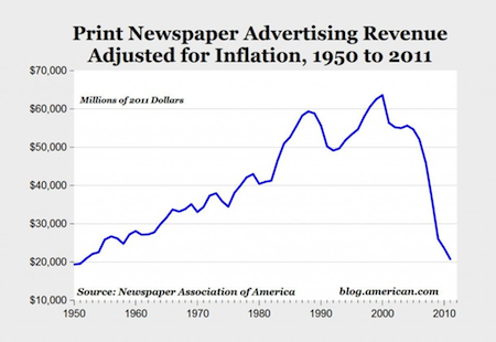 It took 50 years to go from about $20 billion in inflation-adjusted annual newspaper ad revenue in 1950 to $63.5 billion in 2000, and then only 11 years to go from $63.5 billion back to about $20 billion in 2011.
