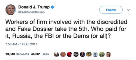 The Democratic National Committee and the Clinton campaign hired the opposition-research firm Fusion GPS in April 2016 to dig up dirt on Donald Trump. Fusion in turn hired former U.K. spook Christopher Steele to assemble the (now largely discredited) dossier. That full dossier of allegations wasn’t made public until after the election, in January 2017. And the media and Democrats continue to peddle the line that it played no role during the election itself.