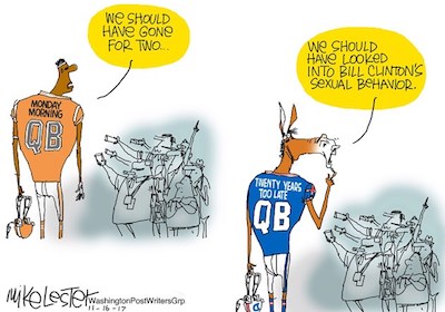 “In the longstanding liberal narrative about Bill Clinton and his scandals, the one pushed by Clinton courtiers and ratified in media coverage of his post-presidency (not only post-presidency, but at all times prior to, duringand after his presidency, particularly at the height of Monicagate!) , our 42nd president was only guilty of being a horndog, his affairs were nobody’s business but his family’s, and oral sex with Monica Lewinsky was a small thing that should never have put his presidency in peril.