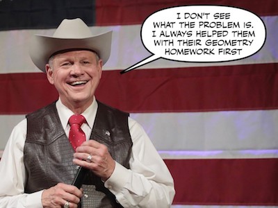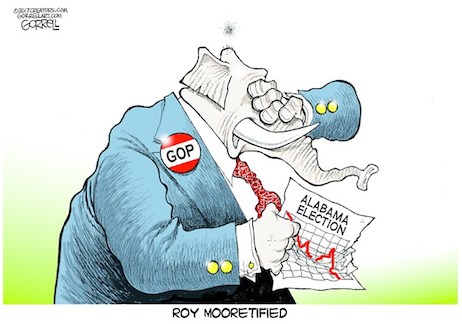 To the extent there is still a Republican mainstream, Roy Moore isn’t in it. Nationally, this group doesn’t like the idea of thirtysomething men dating teenage girls in general and wasn’t so certain that Moore didn’t do something inappropriate with those four named girls. Whatever their concerns about Islam, they don’t think that Muslims should be barred from holding public office. They’re big fans of all the current constitutional Amendments, not just the first ten. They don’t think the era of slavery was great for family values. They don’t think that you could say America is the focus of evil in the modern world. Most Republicans know that you are not legally required to take the oath of office on a Bible; it’s not clear that Moore campaign spokesman Ted Crockett knew this.