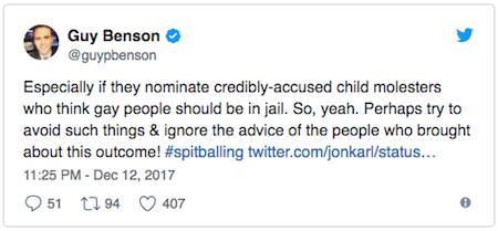 “If I had the top five Republican minds in politics and we spent three months attempting to conceive of a way to lose an Alabama Senate race, I’m not sure that we could come up with it. You could literally take any name out of a phone book except Roy Moore’s and win by double digits. And we managed to get the only guy in Alabama that could lose to a Democrat.”