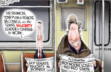 A lot of the blame for last night’s defeat is being laid at the feet of Steve Bannon, with plenty of justification. Congressman Adam Kinzinger: “Bannon is a RINO. His morally inept strategies are unwelcome here.” Congressman Peter King: “After Alabama disaster GOP must do right thing and DUMP Steve Bannon. His act is tired, inane and morally vacuous. If we are to Make America Great Again for all Americans, Bannon must go! And go NOW!!”