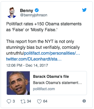 But even if one accepts this bizarre method of comparing presidents, the Times tally is wildly off the mark, based on a Politifact accounting of Obama statements. The left-leaning fact evaluator found more than 18 mostly or entirely false statements by Mr. Obama in his second term alone, never mind all the “half-truths” cited by Politifact.