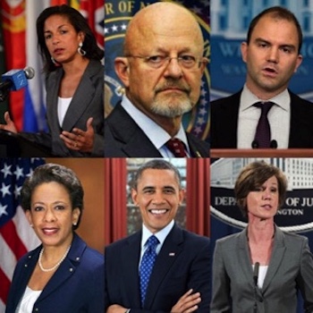 Here are the names and rank of the principal conspirators: John Brennan, CIA director; Susan Rice, National Security Advisor; Samantha Power, UN Ambassador; James Clapper, Director of National Intelligence; James Comey, FBI director; Andrew McCabe, Deputy FBI director; Sally Yates, deputy Attorney General, Bruce Ohr, associate deputy AG; Peter Strzok, deputy assistant director of FBI counterintelligence; Lisa Page, FBI lawyer; and countless other lessor and greater poobahs of Washington power, including President Obama himself.