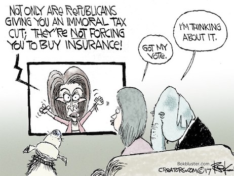 To read all this coverage, you’d be justified in believing that the entire Republican Party had been hit with a stupid stick. Its members united to jack up the taxes of millions of middle-income voters, throw the country into recession, and saddle today’s toddlers with a future debt crisis—all to enable the transfer of tax plunder to fat-cat donors. And not only did it pass this colossally idiotic policy, it did so enthusiastically, in full view of the public—guaranteeing a 2018 GOP midterm wipeout. What dimwits!