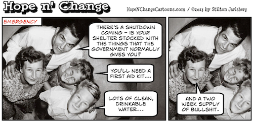 …blame the stalemate on the GOP. Let alone suggest, however remotely, it would or could result in an Extinction Level Event. We’re with Granny Hawkins on this one: