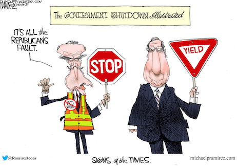 “…The Democrats are trying to spin the media and the public into thinking that the shutdown is the Republicans’ responsibility, pointing out that Republicans “control” both chambers of Congress and the White House and that several Senate Republicans voted against the bill too. It remains the case that the government would be fully open for business if Democrats had not voted against a bill — a bill, again, which has nothing of substance they oppose — to get leverage for the policy they favor. The Democrats’ negotiating stance is: Give us this amnesty, or we’ll make the government shut down and blame you Republicans for it. It is the exact tactic they decried in 2013, when Republicans refused to pass legislation to keep the government funded unless Democrats agreed to a partial repeal of Obamacare.