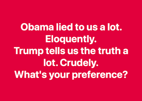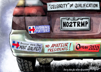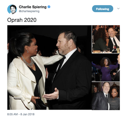 “Hi, I’m Oprah. I’m the spokespersonfor Weight Watchersbut can’t control my weight. I tell you how to run your marriagebut I can’t commit to marriage.I tell you how to raise your kids but I don’t have any. I am very spiritual, but don’t go to any church or identify as Christian.Even though I knew about Weinstein and the casting couch, I was silent, but I support the Me too movement. I am racist to the core, but blacks can’t really be racist, so that doesn’t count. I’m black and female, so I check all the boxes. I praised Denmark for their Socialism, though I am a billionaire due to Capitalism, the economic system that allowed a dirt poor child from Mississippi to rise to world renowned fame and wealth. The first time I openly endorsed a presidential candidate it was a black one, Obama. Before a black candidate, I was not political.Vote for me, and I will give you transformational change, the kind you got from Obama.“