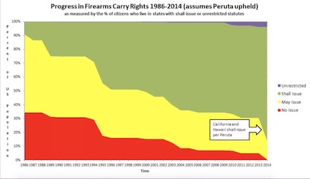 But lest anyone think that the Left always wins cultural battles, let’s consider gun rights. This chart, from David Kopel, shows the change in gun laws from 1986 to 2014. In 1986, less than 10 percent of the American population had “shall issue” access to concealed-carry permits. By 2014?The change was staggering: