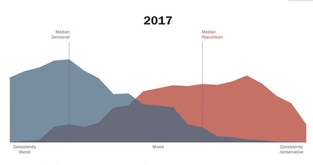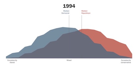Since 1994 the Pew Research Center has been studying political polarization in the United States, and you can watch the two windows form right in front of your eyes. Here are two images that show the difference between the political positions of the “median Republican” and “median Democrat” in the “general public” in 1994 and in 2017: