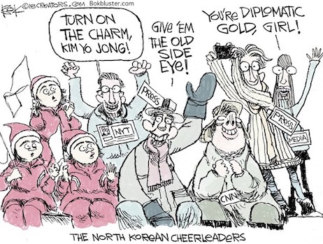 Take, for example, the media’s coverage of North Korea at the Winter Olympics. Suddenly, the worst regime on the planet has been transformed into a cute exhibit from “It’s a Small World.”Those women in red forced to smile and cheer on cue? Just an example of the brilliance of revolutionary North Korean “juche” ideology. Kim Jong Un’s sister, a member of the inner cabinet of a regime that imprisons thousands of dissenters and shoots those who don’t properly worship the Dear Respected? She’s an example of Marxist humility and stellar diplomacy. (Akin, we can only assume, to Barry and Moochie!)