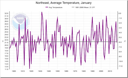 If you believe NOAA’s charts, there was nothing particularly unusual about this winter’s cold weather which caused sharks to freeze in the ocean and iguanas to drop out of trees. Here is NOAA’s January 2018 chart for Northeast U.S. – an area which includes New England along with NY, PA, NJ, DE and MD.