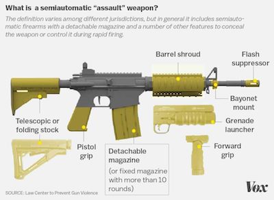 “…semiautomatic firearms with a detachable magazine and a number of other features to conceal the weapon or control it during rapid firing“. Grenades and bayonets not included!