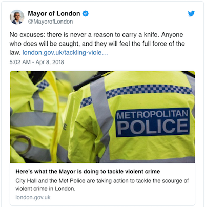 Khan announced Friday that the city has created a “violent crime taskforce of 120 officers” tasked with rooting out knife-wielding individuals in public spaces, and is pumping nearly $50 million into the Metropolitan Police department so that they can better arm themselves against knife attacks. He’s also empowering the Met Police to introduce “targeted patrols with extra stop and search powers for areas worst-affected,” according to a statement.