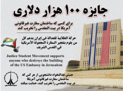 “…A group known as the Iranian Justice Seeker Student Movement is reported to have disseminated posters calling for an attack on the U.S. embassy in Jerusalem, which has been opposed by Palestinian and Iranian officials as an affront to the holy city. “The Student Justice Movement will support anybody who destroy the illegal American embassy in Jerusalem,” the poster states in Farsi, Arabic, and English, according to an independent translation of the propaganda poster provided to the Free Beacon.