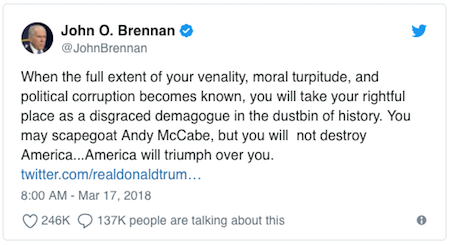 Note the dates on the tweets: exactly like Andy McCabe, Brennan’s not only an a*shole, but a lying a*shole at that! That this a*sclown was given positions of ever-increasing authority speaks directly to the moral and ethical bankruptcy of the Obama Administration.