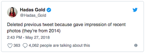 Gold eventually deleted her tweet and wrote, “Deleted previous tweet because gave impression of recent photos (they’re from 2014),” but hundreds of responses ripped the CNN reporter (deservedly!) for the misleading tweet.