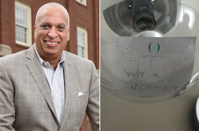 “An African-American millionaire and his Manhattan consultant son were victims of a July 4th hate crime in their hotel room during a Florida vacation. A racist creep(Is that an industry term?!?)apparently snuck into Frank and Michael Davis’ room at the upscale Art Ovation Hotel in Sarasota and left a 2-by-5 post-it note reading, “You’re a N—-R.”