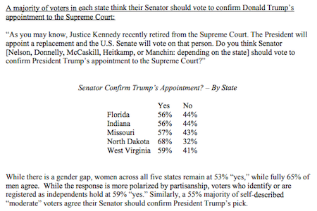 The Susan B. Anthony List commissioned a poll of registered voters in Florida, Indiana, Missouri, North Dakota, and West Virginia, and asked voters, “As you may know, Justice Kennedy recently retired from the Supreme Court. The President will appoint a replacement and the U.S. Senate will vote on that person. Do you think Senator [Nelson, Donnelly, McCaskill, Heitkamp, or Manchin: depending on the state] should vote to confirm President Trump’s appointment to the Supreme Court?” (Note this poll is conducted before Kavanaugh was named.)