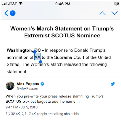 First up, in their rush to express an opinion formulated well in advance of The Donald’s announcement, the Women’s March tells us all we need to know about The Left’s collective refusal to give any SCOTUS nominee Trump might name anything resembling a fair hearing: